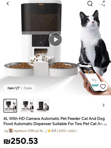 מתקן האכלה אוטומטי לחיות מחמד. היה בשימוש שנה. יש אופציה להוסיף צליל של הקלטה לפני שהאוכל יוצה. עם מצלמה. מתחבר דרך הwifi. אפשרות להחניס סוללות וגם לחבר למתן. עובד לפי השעות שנבחרו. החתול שלי תמיד גונב את האוכל של החתול השני, בגלל זה מוכרת את המכשיר.
