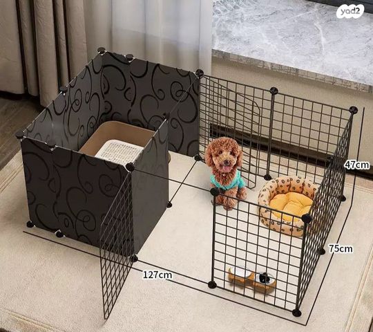 גדר תיחום סוויטה חדשה באריזה. גדר מודולרית שהופכת את המתחם של החיה שלכם לסוויטה מפנקת עם חלקים שניתן לפרק ולחבר, קירות אטומים לפרטיות ובידוד וקירות רשת. מושלם לכלבים או חיות קטנות. מידות 127×47×75 בצבעים לבן/שחור.