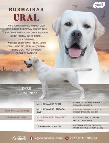המלטת גורי לברדור מתועדת ברמה גבוהה מאוד. הגורים נולדו ב- 15/12 זוג ההורים עברו את כל הבדיקות הנדרשות והכול תקין לחלוטין. אבא "אוראל" משושלת אלופי עולם ואירופה. אוראל בעצמו סגן אלוף עולם ואלוף ישראל. האמא "וונדי" מצטיינת תערוכות וכלבת עבודה טיפולית . הגורים ימסרו לאחר ביקורת שגר המטעם ההתאחדות, חיסון משושה, תילוע ושבב.