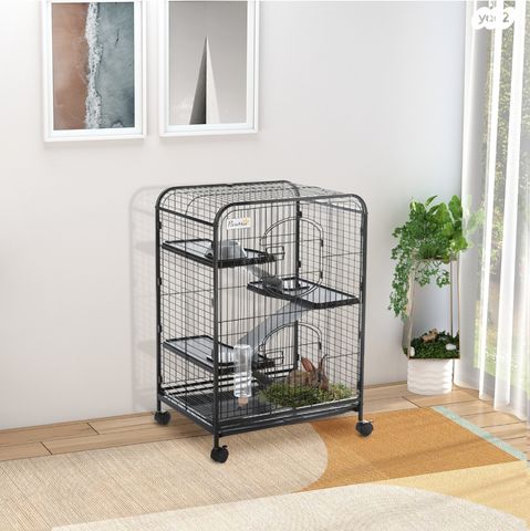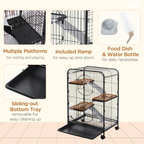 כלוב ענק ואיכותי במידות 92.5*43.5*64 ס"מ, כולל גלגלים להקלה בשינוע, עשוי מרשת ברזל עבה נגד חלודה. מאובזר! מגיע עם שירותים, בקבוק שתיה, שני סולמות ו3 קומות פלסטיק (לא מחליד!), שתי דלתות פתיחה ועם מגירה נשלפת בתחתית להקלה בניקוי, קיים בצבע שחור.