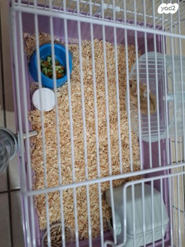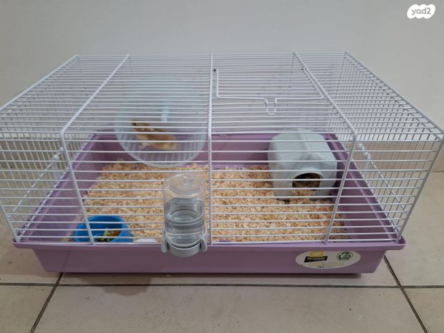 אוגרת סיבירית + כלוב + בית מסתור + גלגלת+ מתקן עם בקבוק למים + קערית אוכל