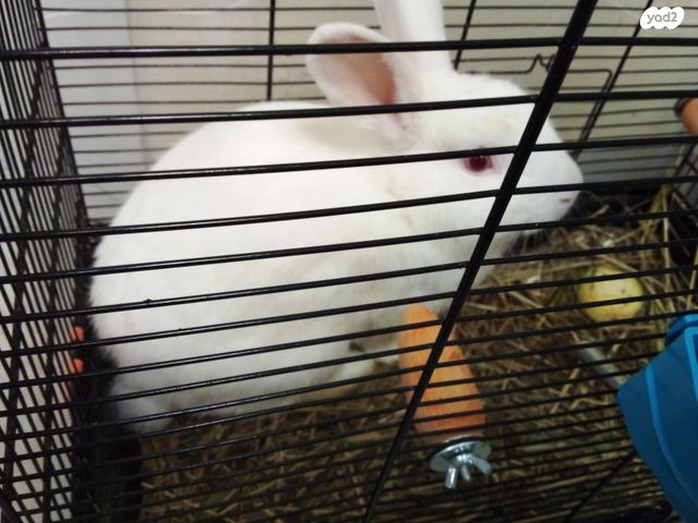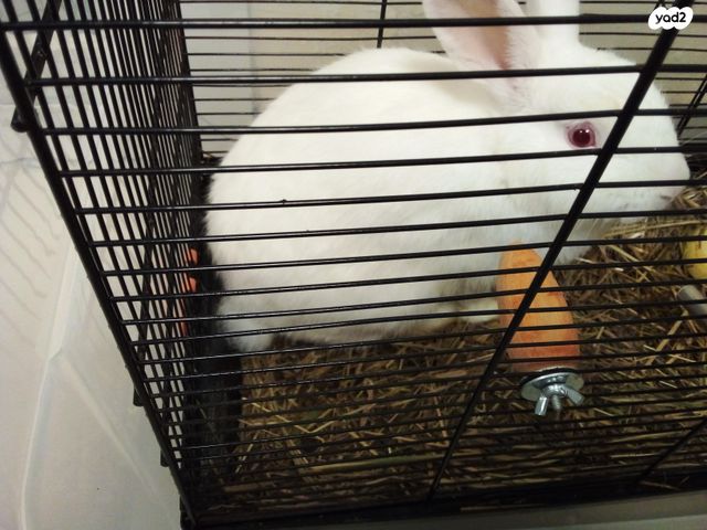 ארנבת לבנה בלי כלוב קנינו לפי כמה ימים ממשפחה, עם כלוב מאד קטן, לא מתאים לארנבת, לכן מוסרת, מוסרת גם את המים, ואוכל, וצעצועים דמוי גזר