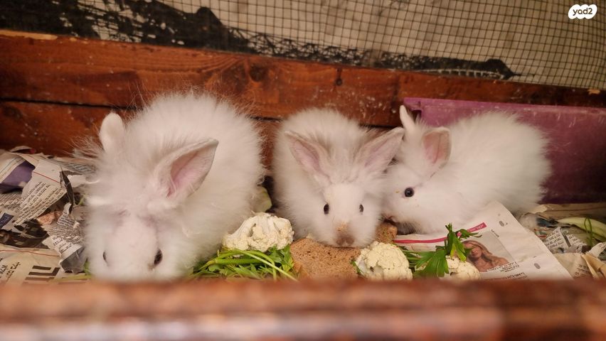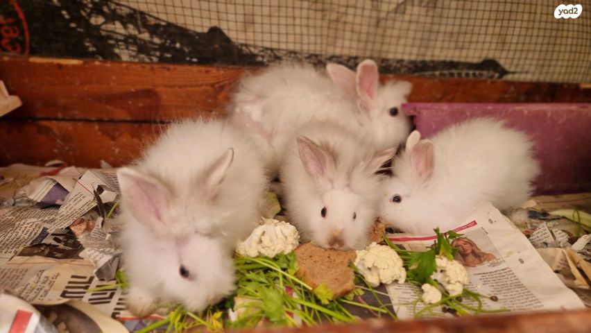גורי ארנבון אנגורה לבנים עם עיניים כהות בני חודשיים