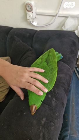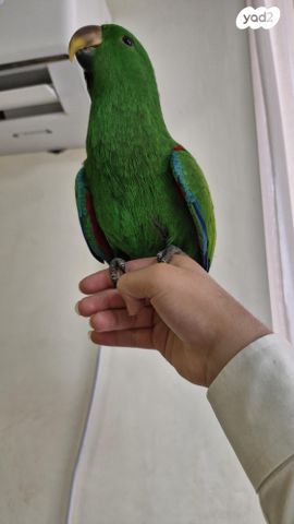 תוכי אקליקטוס ירוק עם אדום יפה, חברותי , אוהב חברה בן 7 חודש עולה על היידים, והכתפיים, היה אכלת יד כעת אוכל באופן עצמוני. ואנחנו נותנים לו ביד גם פירות וירקות ופיצוחים