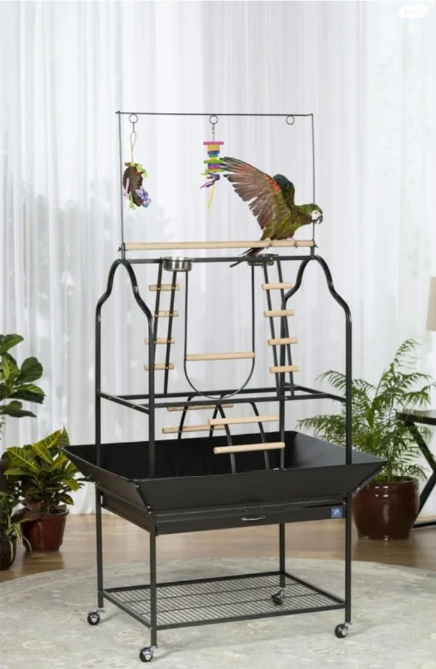 סטנד מגרש משחקים ענק מטורף לתוכים גדולים! חדש באריזה מגיע בשחור המרייט וכולל כלי נירוסטה, מגש נשלף לניקיון, עגלה עם מדף וגלגלים וחצאית במידות 76×56×1.7 ענקקק. מושלם לתוכים גדולים או לבתים מרובי תוכים