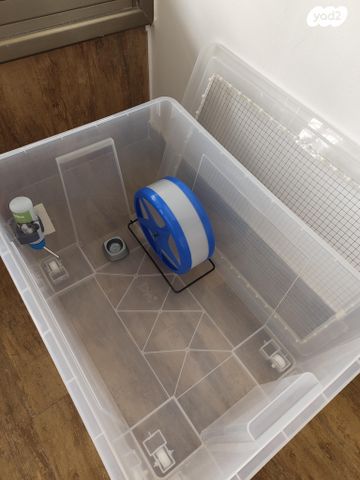 כלוב פלסטיק עצום לאוגר עם מכסה מרשת מתכתית + גלגל ריצה גדול + מתקן שתיה + קערה קטנה לאוכל גובה: 44 אורך: 79 רוחב: 56