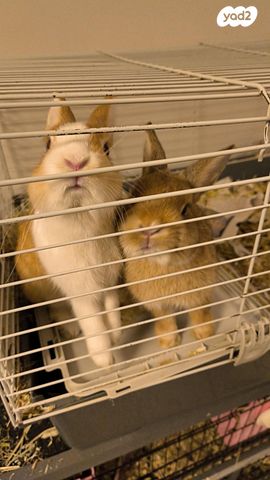 זוג ארנבים הולנדי ננסיים (2 זכרים) אחד בן כ3 חודשים, השני כ4 חודשים כולל כלוב גדול ובקבוק שתייה