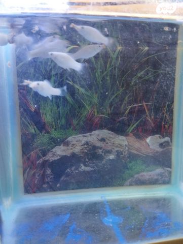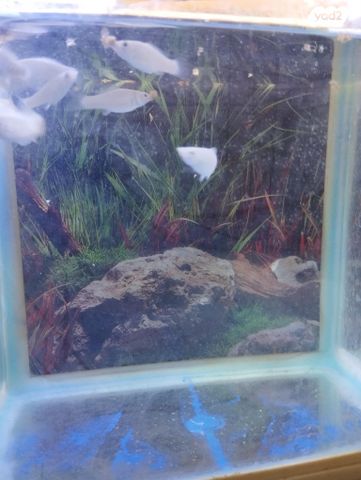 9 דגי מולי לבנים מאוד גידול ביתי בתנאים טובים נמכרים כולם ב50 גודל בין 4-5 ס"מ (הדגים איננו חיים באקווריום הזה הם הועברו לשם בשביל התמונות)