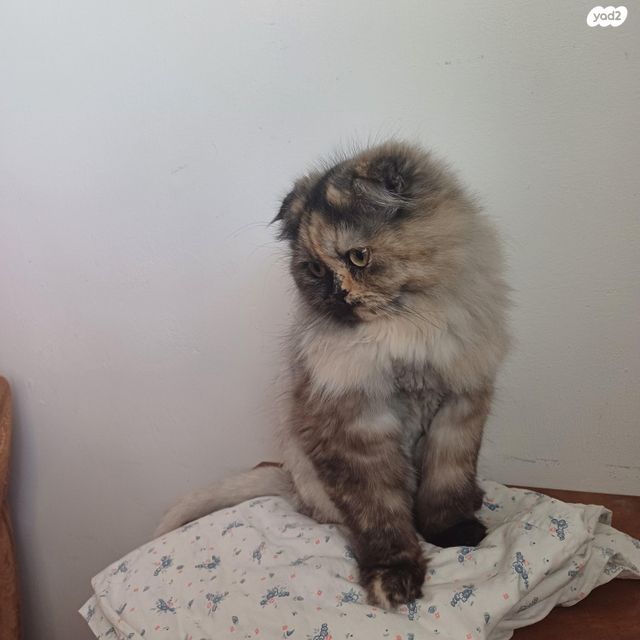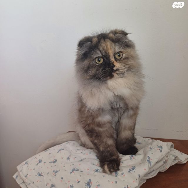 נקבה סקוטי פולד עם פרווה ארוכה. ידנית. אוזניים קטנות ומוטות. גודלה עם ילדים.