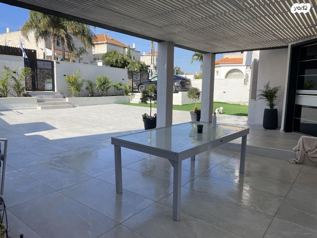 גינה ענקית בקידמת הבית כוללת פרגולה ופינת ישיבה ועצי נוי