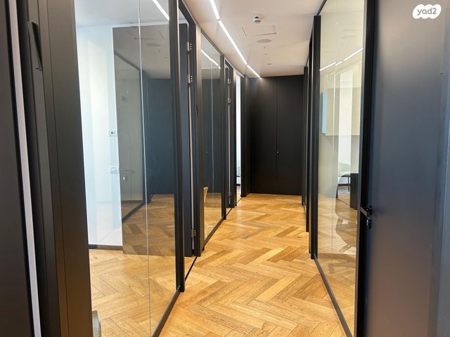 גמר מושקע ברמה גבוהה הכול תקרה חשופה, חלוקה בזכוכית אינובייט עם פרזול שחור ופרקט פיש בון בכל המשרד.