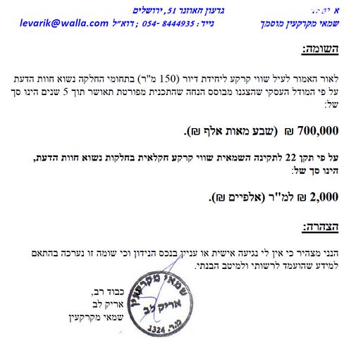 שווי יחידת קרקע זמינה (150 מ"ר) 1,200,000 - לפי דוח שמאי חיצוני.
