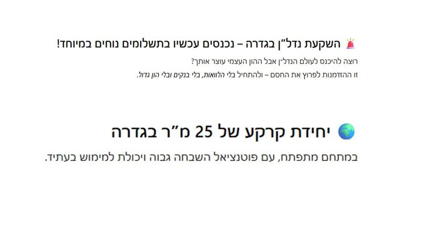 הזדמנות נדל"ן בגדרה נכנסים להשקעה גדולה בתשלומים קטנים. לא צריך הון עצמי. לא צריך הלוואות. לא צריך לחכות. זה הזמן להיכנס לשוק הנדל"ן עכשיו.