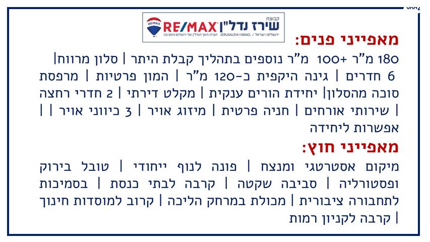 6 חדרים | גינה היקפית כ-120 מ"ר | המון פרטיות | מרפסת סוכה מהסלון| יחידת הורים ענקית | מקלט דירתי | 2 חדרי רחצה | שירותי אורחים | חניה פרטית | מיזוג אויר | 3 כיווני אויר | | אפשרות ליחידה