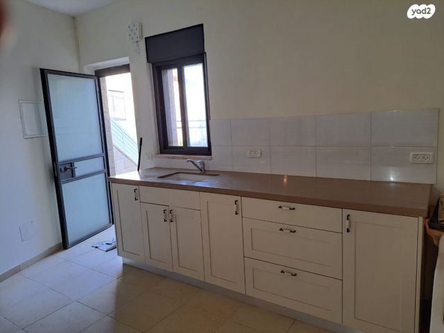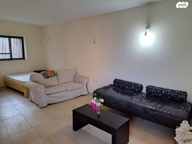 מרוהטת חלקית: מיטה זוגית, ספה ושולחן, מקרר ומכונת כביסה.