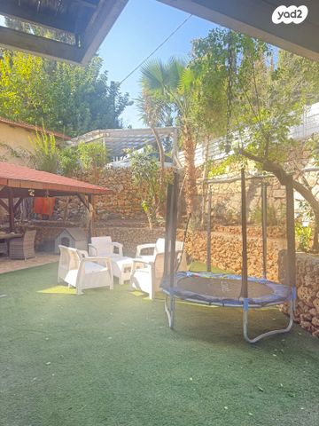 דירת גן עם חצר פרטית גדולה הכוללת דשא סינטטי וגינה עם עצים יפים.