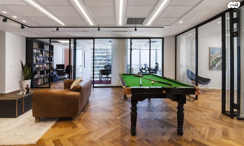 משרד בגמר מפואר הכולל פרקט פישבון בכל המשרד, חלוקה במחיצות זכוכית אינובייט, גופי תאורה מעוצבים ועוד..