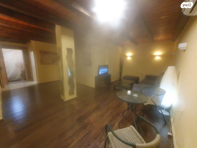 יחידה מרוהטת בסלון, שולחן סלון, מיטה זוגית, טלוויזיה, פרקט. עץ בתקרה בסגנון צימר.