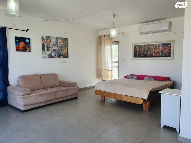 - ספה, מיטה זוגית, שולחן משרדי ושתי כיסאות, שידה ומקרר.
