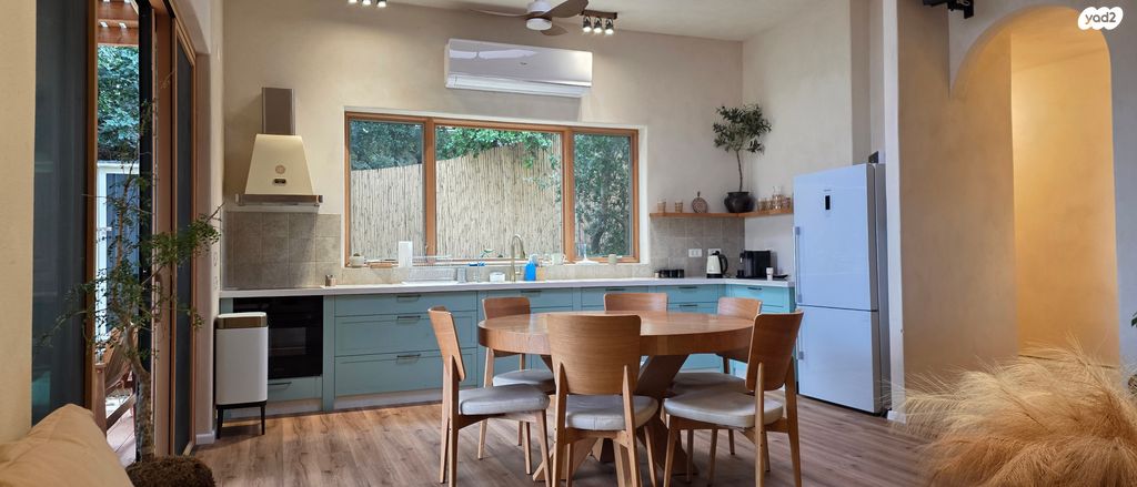 המטבח מאובזר לחלוטין כולל שולחן גדול וכסאות.