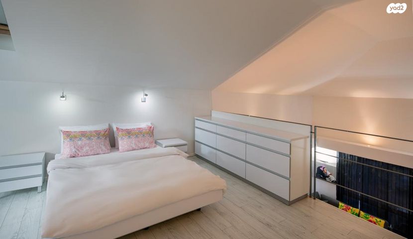 מפלס עליון : חדר שינה מפנק עם חלונות בגג, + חדר רחצה מעוצב וגדול עם חלונות בגג .