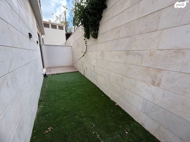 גינה קטנה עם דשא ואזור אירוח עם דק מעץ, מערכת השקיה ואזור גינון.