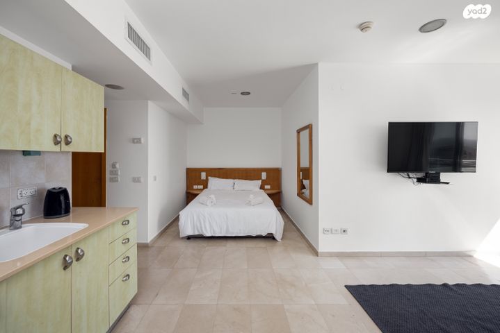 סטודיו עם ממ"ד קטן ומרפסת פונה לים, מרוהט עם מיטה זוגית, סלון ופינת אוכל מטבחון מאובזר.