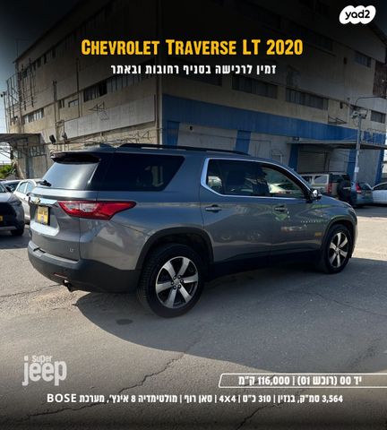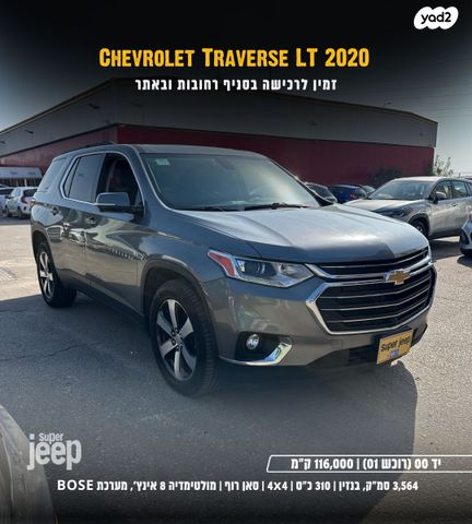 זמין עכשיו בסניף רחובות - שברולט Traverse LT | שנת 2020 | יד 00 (רוכש 01) | 116,000 ק"מ | 3,564 סמ"ק, בנזין | 310 כ"ס | 4 על 4 | סאן רוף | מולטימדיה 8 אינץ', מערכת BOSE | כורסאות חשמליות, ריפודי עור בצבע שחור | חימום במושבים קדמיים | ג'נטים 18 אינץ' | חבילת בטיחות: בקרת שיוט רגילה, שמירה על נתיב,