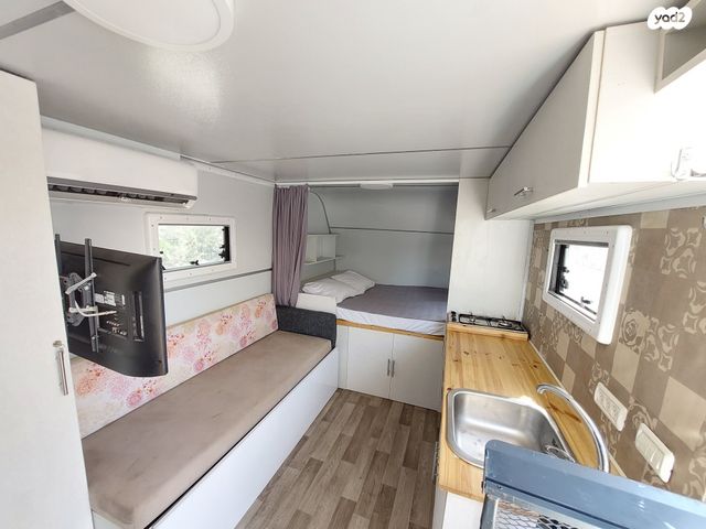 קארוון נייד משופץ מיטה זוגית ועוד מיטת יחיד נפתחת ל2 מטבח עם כיור מקרר כיריים מקומות איחסון טלויזיה מגזין שירותים ומקלחת