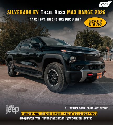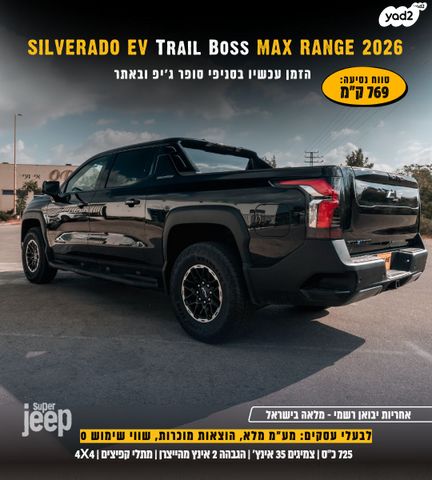 דגמי Trail Boss 2026 | יד 00, חדש | חשמלי מלא | טווח 769 ק"מ | 4 על 4 | 725 כ"ס | ריפודי עור | כיסאות חשמליים עם אוורור וחימום, כיסאות צד אחוריים חימום, חימום בהגה | מצב 4 גלגלים מסתובבים יחד | מסך 17.7 מערכת BOSE| גנט 18 צמיג 35 | הגבהה 2 אינץ, מתלי קפיצים | מס מצבי נהיגה | מצלמות 360 HD, קרוז אדפטיבי, שמירה על נתיב, התראות צד ואחורי, בליינד זון, בלימה אוט | חבילות פרמיום, נוחות, טכנולוגיה |