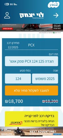 היי מוכר יד 0 ברישיון אני הבעלים הראשונים הונדה pcx 125 שנת 2025 אופנוע חדש נקנה מהחברה לפני חצי שנה עם 5,300 קילומטרים בלבד 2 מפתחות שלט חכם יש 5 מנעולים 2 קסדות משומשות מעמד לטלפון קשיח וחזק תוספות יש מוכר עקב מעבר לרכב טסט עד יוני אופנוע אמין חסכוני בדלק מי שרוצה לקנות רק העברת זה"ב בלבד ובאתר גוב (: וטיפה גמיש