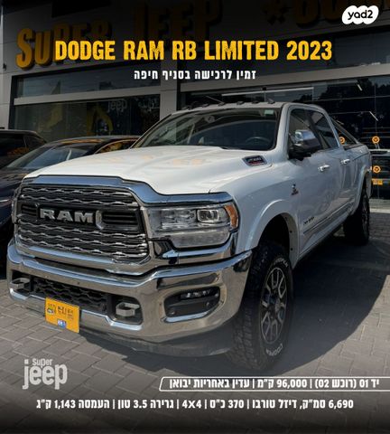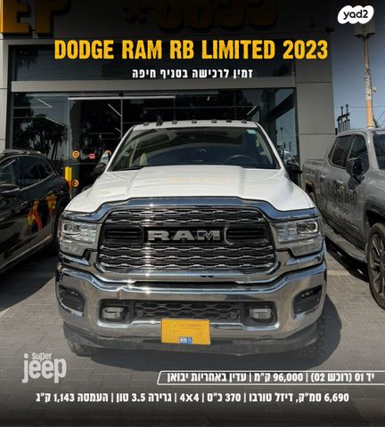 מין עכשיו בסניף חיפה - דודג' ראם RB LIMITED | שנת 2023 | יד 01 (רוכש 02) | 96,000 ק"מ | 6,690 סמ"ק, דיזל טורבו | 370 כ"ס, 117 טורק | 4 על 4 | גרירה 3.5 טון, העמסה 1,143 ק"ג, וו נשלף | סאן רוף | מולטימדיה 17 אינץ' | כיסאות חשמליים, ריפודי עור בצבע בז'