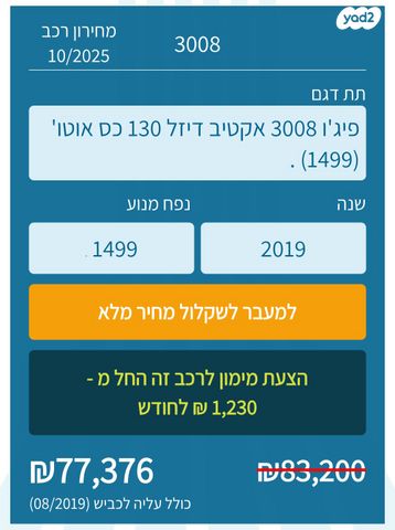 - רכב שמור ומטופל. ללא תאונות - מתחייב בבדיקה. ביד הראשונה ליסינג פרטי. - הוחלף מנוע למנוע חדש - לאחר טסט והחלפה של ארבעת הצמיגים שמולאו בחנקן וטיפול גדול שכלל החלפת רפידות ומצתים, והתקנה של מצבר חדש. - קיים וו גרירה, השחרה בחלונות האחוריים, מראות מתקפלות ומולטימדיה. - דיזל חסכוני מאוד - רשום כרכב נכה - העברת הבעלות על חשבוננו. - מחירון משוקלל לוי יצחק 77,000 - לא מיועד לסוחרים ולא בשבת