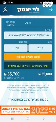הונדה CRV Comfort 2013 יד שנייה שתי ידיים פרטיות קילומטרז' 197,000 ק"מ 4x4 משולב מצב מכני מעולה רכב אמין ושמור טסט עד 12/2026 רכב חזק, מרווח, בטיחותי ונוח נמכר עקב שדרוג
