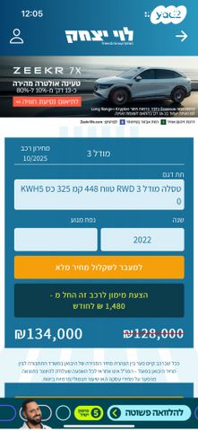 טסלה מודל 3, שנת 2022, יד ראשונה, 62,800 ק"מ. במצב מעולה, שמור מאוד, ללא תאונות וללא תקלות. מטופל אך ורק במוסך הרשמי של טסלה. כל הטיפולים בזמן, כל החלקים מקוריים בלבד. טסט חדש עד נובמבר 2026 בעלות פרטית צבע חוץ שחור, צבע מושבים שחור. הרכב נוסע חלק נמכר בשל מעבר מגורים לחו''ל. הרכב נמצא בעיר יבנה, מחירון לוי יצחק 134,000ש"ח. יש קצת גמישות למי שיסגור מהר לפרטים נוספים נא להתקשר