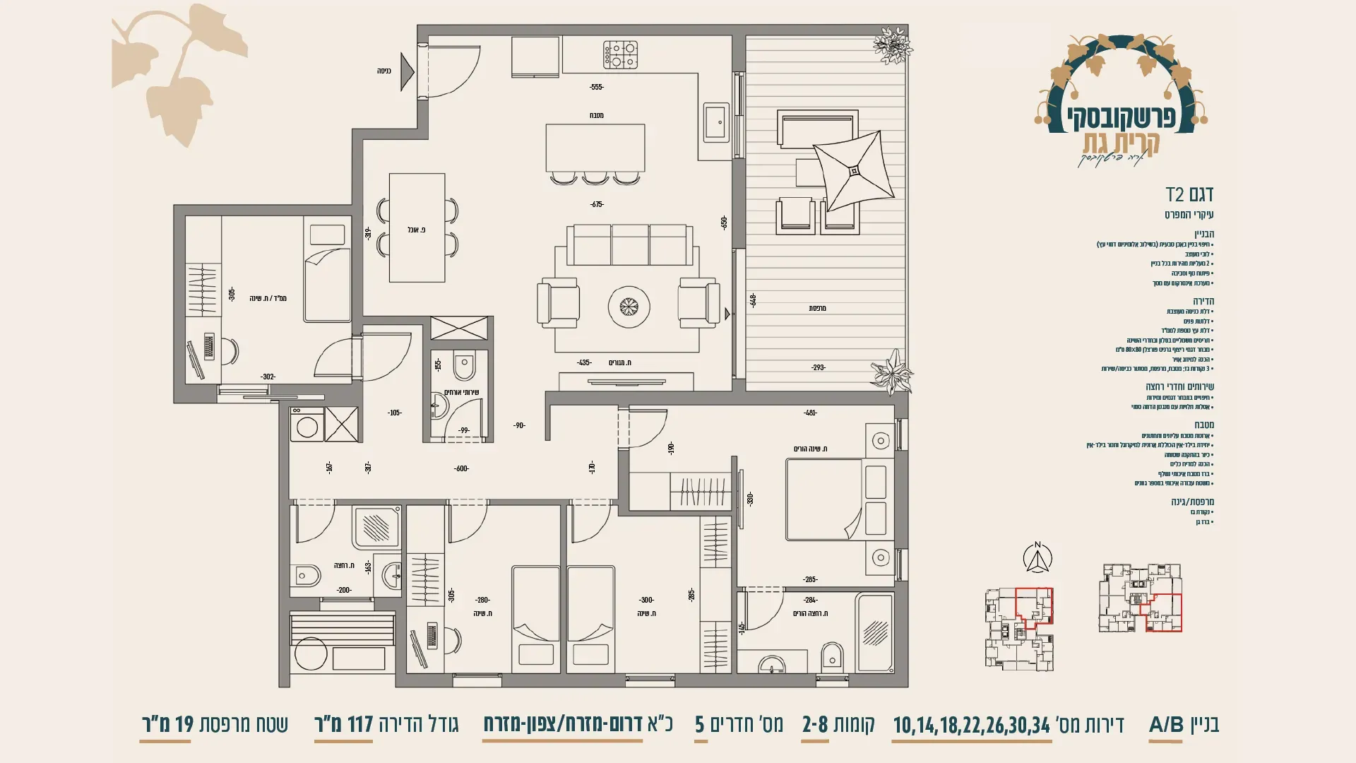 הפרויקט מציע דירות 3, 4 ו5 חדרים, דירת גן ופנטהאוז / גג במגוון גדלים וקומות.