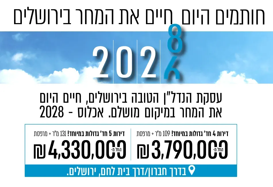 התנופה 9 ירושלים | דירה בבית קומות | 05.10.2025 | 4 | 100 | 4 | 2030 | 3,980,000 ₪ |